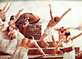 27 At noon Elijah began to taunt them. “Shout louder!” he said. “Surely he is a god! Perhaps he is deep in thought, or busy, or traveling. Maybe he is sleeping and must be awakened.” 28 So they shouted louder and slashed themselves with swords and spears, as was their custom, until their blood flowed. 29 Midday passed, and they continued their frantic prophesying until the time for the evening sacrifice. But there was no response, no one answered, no one paid attention.