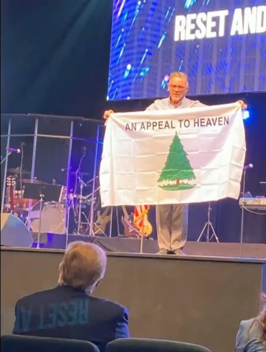 The flag, featuring a pine tree with the motto "An Appeal to God" or, more usually, "An Appeal to Heaven", was used originally by a squadron of six cruisers commissioned under George Washington's authority as commander in chief of the Continental Army in October 1775. :