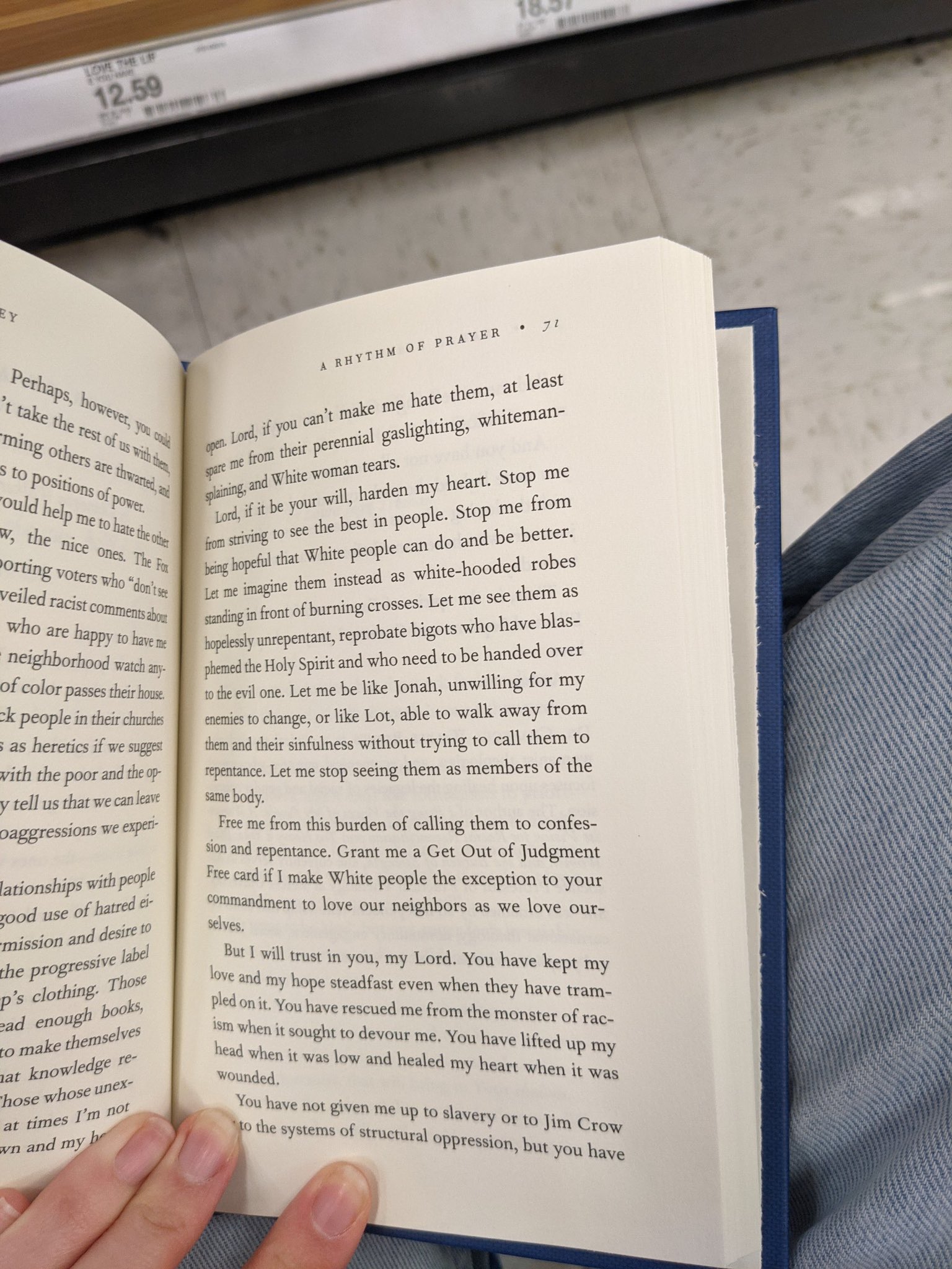 Screenshots of the devotional book A Rhythm of Prayer: A Collection of Meditations for Renewal were posted online last week by users who objected to the inclusion of a prayer titled "Prayer of a Weary Black Woman" by Chanequa Walker-Barnes, a professor of practical theology at Mercer University.