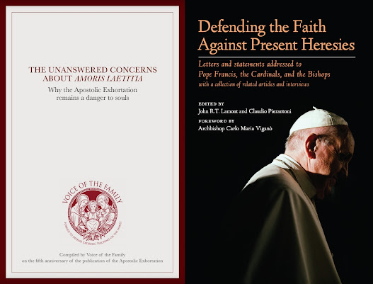 The second volume, Defending the Faith against Present Heresies, is edited by Professors John R.T. Lamont and Claudio Pierantoni and has a preface by Archbishop Carlo Maria Viganò. Both works contain the texts of the Dubia and Correcio filialis. The Voice of the Family book includes in addition “Theological Censures against Amoris Laetitia” by forty-five theologians and the May 2019 “Declaration of the Truths Relating to Some of the Most Common Errors in the Life of the Church of Our Time”. Lamont and Pierantoni’s book contains, in addition to the "Theological Censures", the “Open Letter to the Bishops of the Catholic Church”, “An Appeal to the Cardinals of the Catholic Church”, and the protest Contra recentia sacrilegia. In his introduction, John Lamont recalls how these documents came into being; the book also includes contributions by Anna M. Silvas, Fr John Hunwicke, Claudio Pierantoni, Claire Chretien, Roberto de Mattei, Robert Fastiggi and Dawn Eden Goldstein, Joseph Shaw, Michael Sirilla, Edward Peters, Edward Feser, Fr Brian Harrison, John Rist, Peter A. Kwasniewski, Maike Hickson, Thomas G. Weinandy, O.F.M. Cap, Pauper Peregrinus, and Professor Lamont himself.