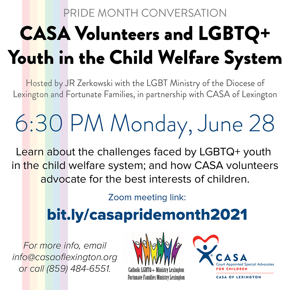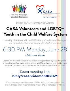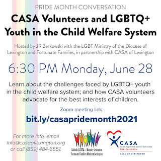 To: Parishes and Missions of the Catholic Diocese of LexingtonFrom: Diocesan CommunicationsPride Month Conversation Resources for ParishesPlease find the attached promotional materials for a Pride Month Conversation: CASA Volunteers and LGBTQ+ Youth in the Child Welfare System, hosted by JR Zerkowski with the LGBT Ministry of the Catholic Diocese of Lexington and Fortunate Families, in partnership with CASA of Lexington. The event is via Zoom at 6:30 p.m. on Monday, June 28.For more information, email: info@casaoflexington.org or call: (859) 484-6551# # #