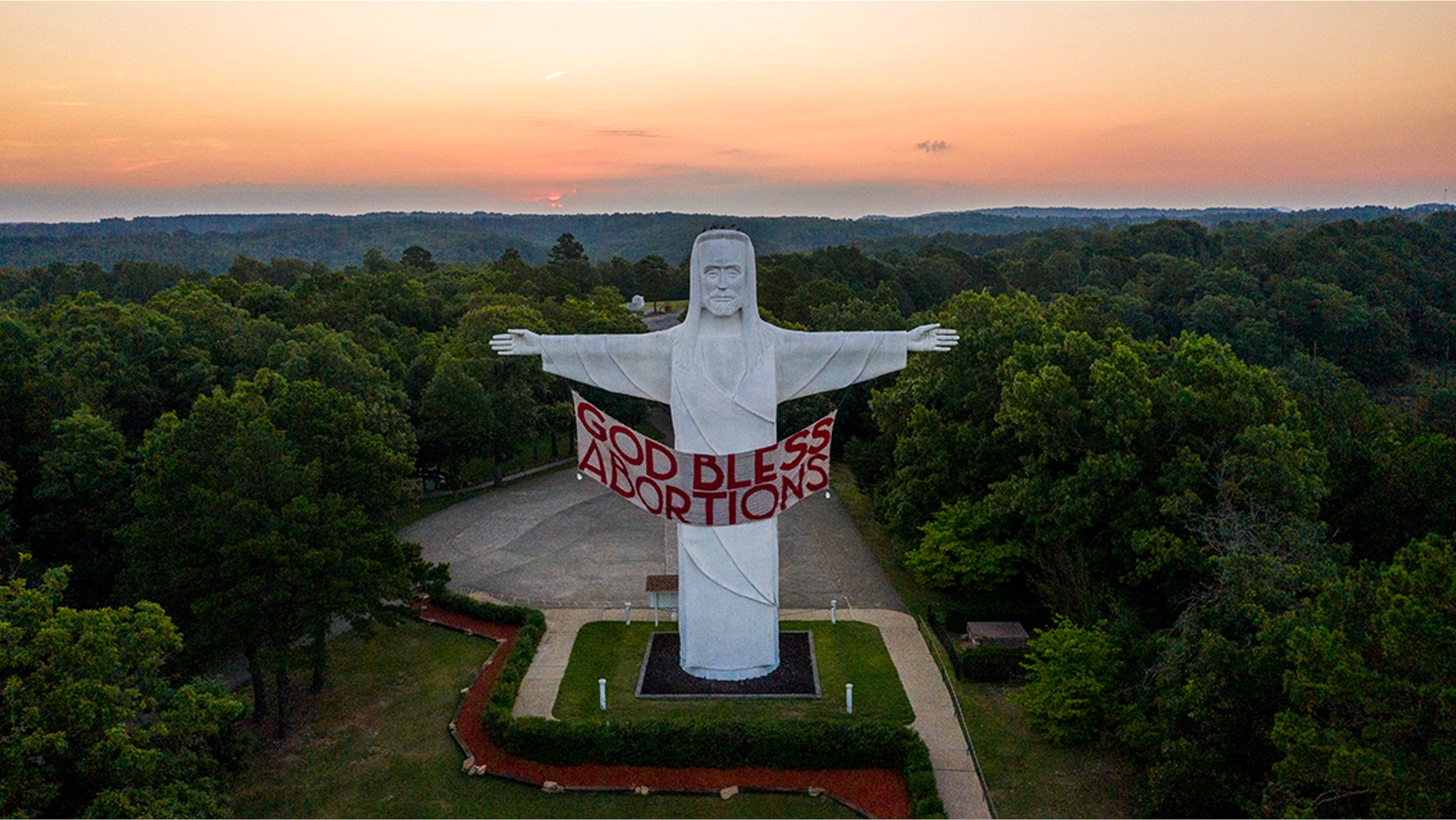 Indecline, a two-decade-old activist art collective, hung a 44-foot banner that reads "GOD BLESS ABORTIONS" on a massive monument of Jesus in northwestern Arkansas Thursday night.