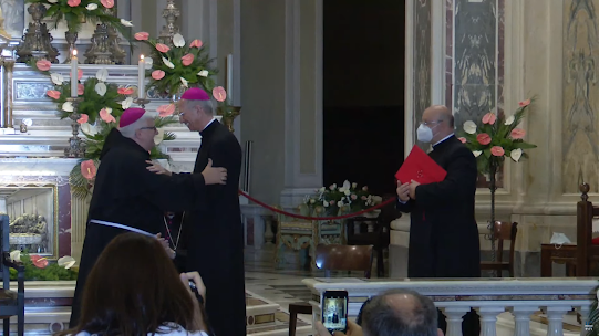 The same announcement was made at the Santuario della Madonna della Guardia by the Archbishop of Genoa, Marco Tasca OFMConv. Msgr. Marini was present and Tasca placed the purple zucchetto on the new Bishop-elect right after.