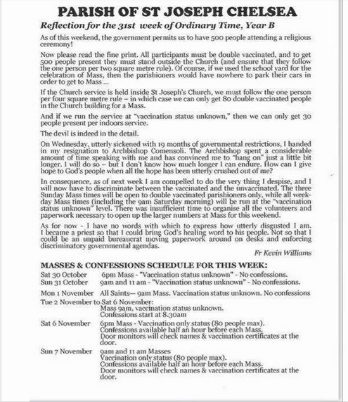 A letter from Father Kevin Williams to his parish of St. Joseph in Chelsea, Victoria, shows that priests have been forced by Comensoli to divide attendees of ceremonies according to their COVID jab status from at latest the end of October: