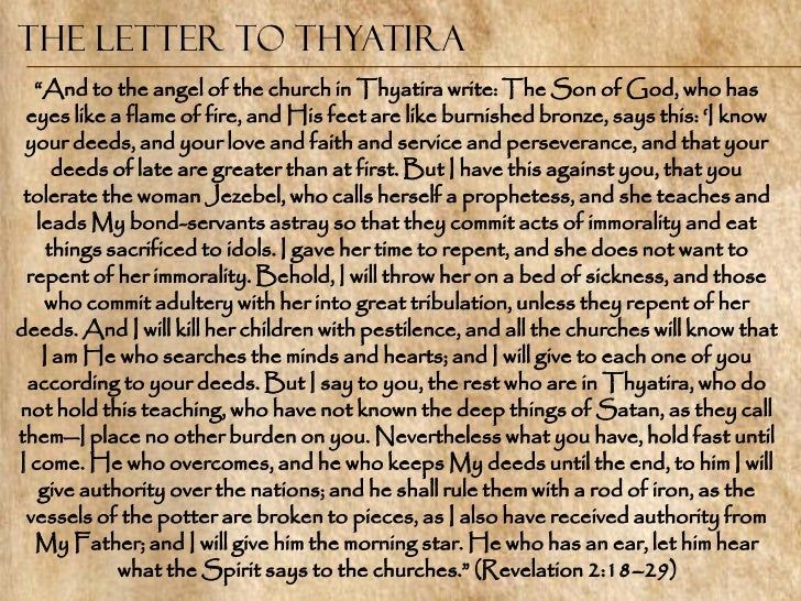 Whatever theory they hold, most scholars agree that the Church in Thyatira pictures a thriving church that has allowed corruption to ruin it.