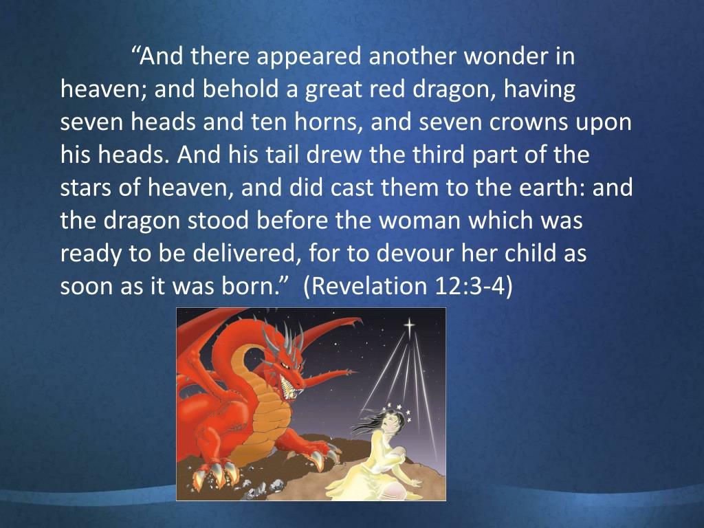 12 A great sign appeared in heaven: a woman clothed with the sun, with the moon under her feet and a crown of twelve stars on her head. 2 She was pregnant and cried out in pain as she was about to give birth. 3 Then another sign appeared in heaven: an enormous red dragon with seven heads and ten horns and seven crowns on its heads. 4 Its tail swept a third of the stars out of the sky and flung them to the earth. The dragon stood in front of the woman who was about to give birth, so that it might devour her child the moment he was born. 5 She gave birth to a son, a male child, who “will rule all the nations with an iron scepter.”[a] And her child was snatched up to God and to his throne. 6 The woman fled into the wilderness to a place prepared for her by God, where she might be taken care of for 1,260 days.