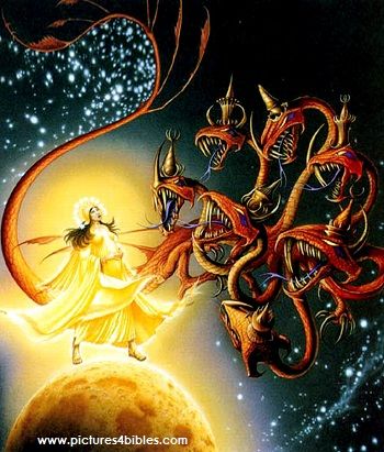 The stunning Vision in Revelation 12 has been interpreted in a number of ways. Catholic Scholars see the Woman as the Virgin Mary, and the iconograpy reflects this, showing the crescent moon beneath her feet and the crown with Twelve Stars. Some pictures also show her treading upon a snake, but in the Vision, the serpent is chasing after her, not the other way around. because of the Crown of Twelve Stars, Protestant Scholars say that she represents Zion, and the Stars are the Twelve Tribes of Israel. The Male Child is, of course, Jesus the Messiah, and fits both interpretations. The part about the Woman and her children being persecuted and chased into the wilderness by satan also fits both.