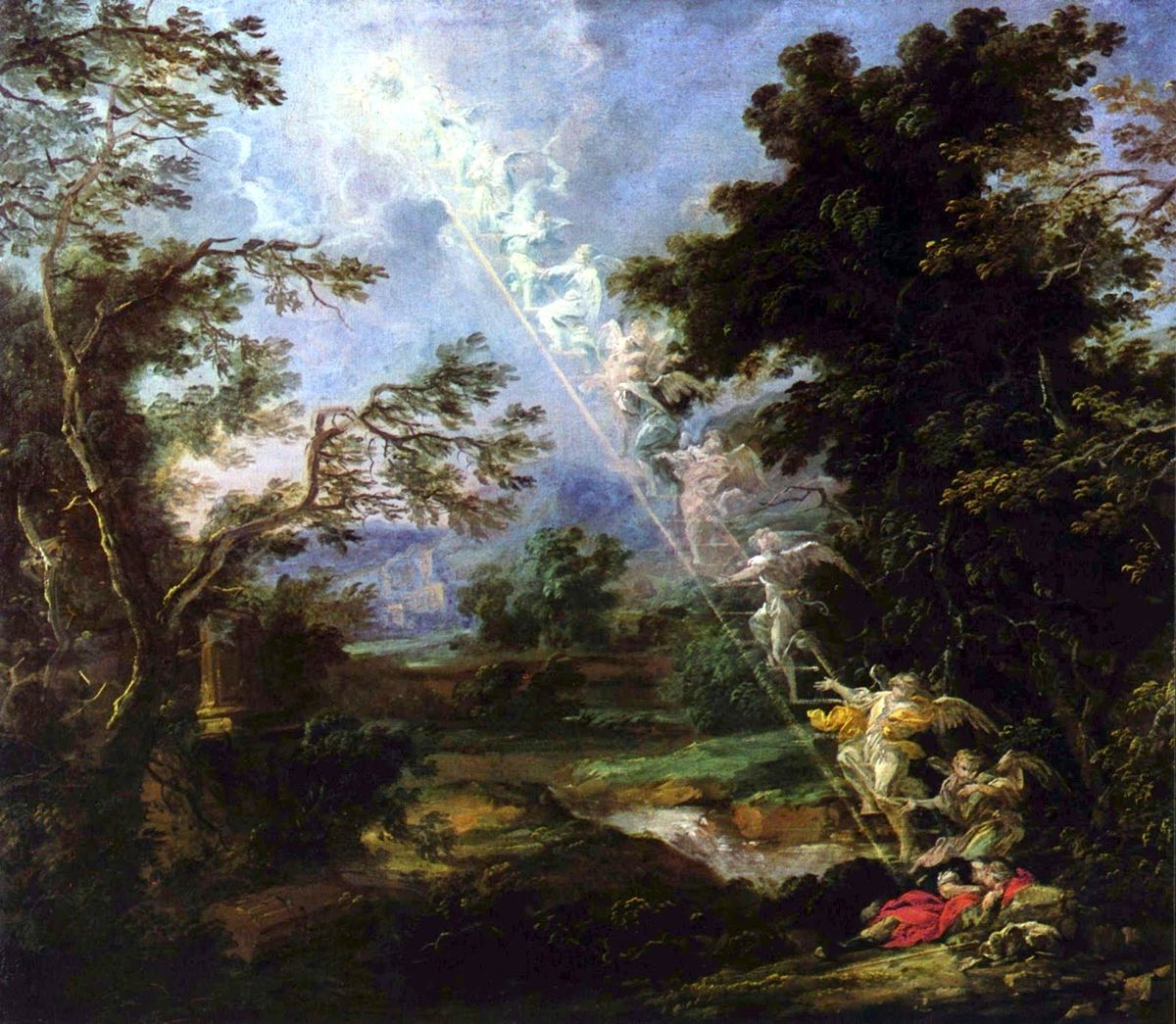 10 Jacob left Beersheba and set out for Harran. 11 When he reached a certain place, he stopped for the night because the sun had set. Taking one of the stones there, he put it under his head and lay down to sleep. 12 He had a dream in which he saw a stairway resting on the earth, with its top reaching to heaven, and the angels of God were ascending and descending on it. 13 There above it[c] stood the Lord, and he said: “I am the Lord, the God of your father Abraham and the God of Isaac. I will give you and your descendants the land on which you are lying. 14 Your descendants will be like the dust of the earth, and you will spread out to the west and to the east, to the north and to the south. All peoples on earth will be blessed through you and your offspring.[d] 15 I am with you and will watch over you wherever you go, and I will bring you back to this land. I will not leave you until I have done what I have promised you.”
