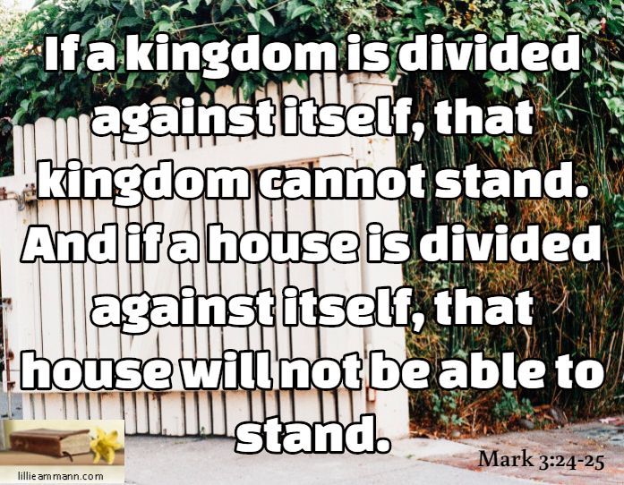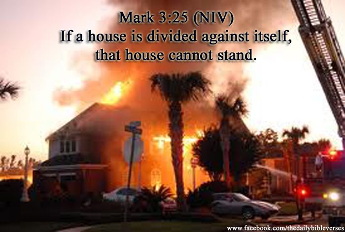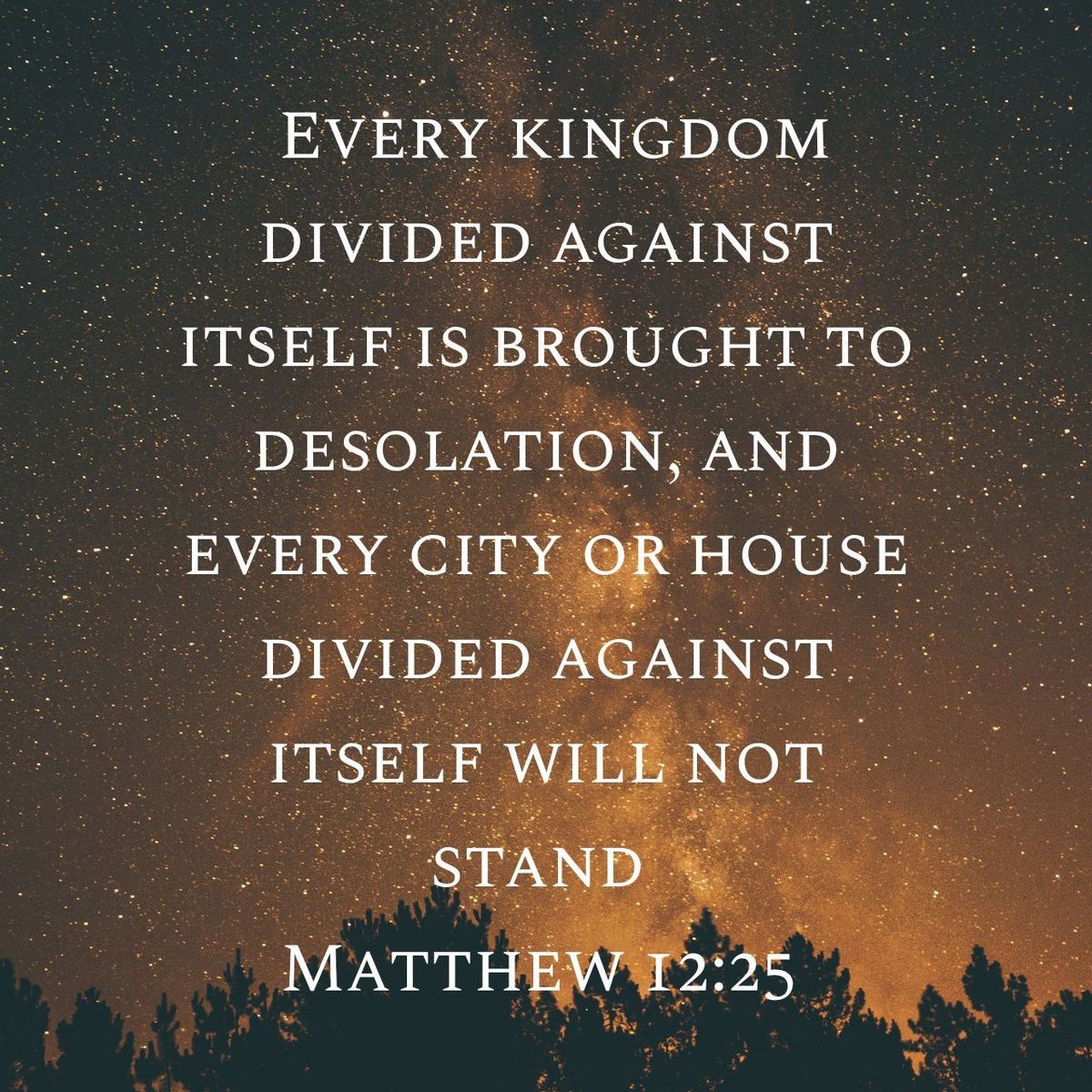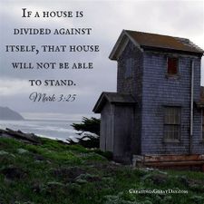 While Lincoln used this to describe political divisions, Jesus was speaking of spiritual divisions, specifically, the spiritual realm of the prince of darkness. At this point in His Ministry, Jesus was being accused of using occult powers to cast out demons and heal people. (note that the Pharisees were using Alinsky Rule #5..."Accuse your opponent of doing who you yourself are guilty of") Of course, Jesus sees right through the tactic, and responds with this wonderful quote. It is perfect logic. Why would Satan cast himself out?