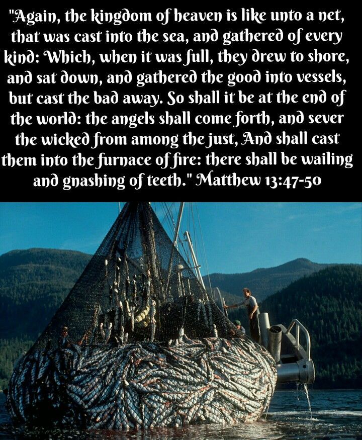 47 “Once again, the kingdom of heaven is like a net that was let down into the lake and caught all kinds of fish. 48 When it was full, the fishermen pulled it up on the shore. Then they sat down and collected the good fish in baskets, but threw the bad away. 49 This is how it will be at the end of the age. The angels will come and separate the wicked from the righteous 50 and throw them into the blazing furnace, where there will be weeping and gnashing of teeth.