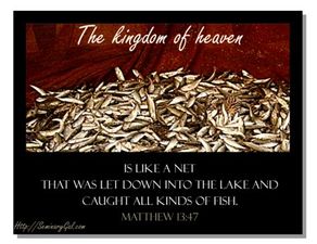 The last of the "Kingdom Parables" in this section of the Gospel of Matthew compares the Kingdom of Heaven to a Fishnet cast into the sea. Most of the Disciples had come out of the Commercial Fisheries on the Sea of Galilee. It was a tough life. Even a huge net full of fish did not mean instant profit. A bulging net could contain some bad-tasting, or even inedible fish, as the net just indiscriminately scoops them all up at the same time. The fishermen not only have to catch the fish, they have to sort them out as well. This Parable didn't need any explanation for the Disciples, so Jesus just asks them "Did you understand this one?", and of course they did.