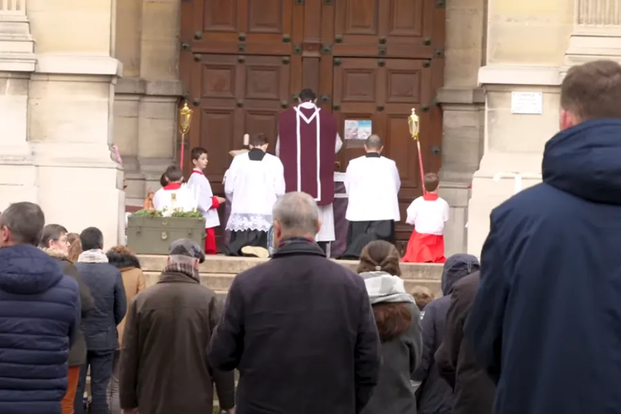 A Traditional Latin Mass on the steps of the hospital chapel in Saint-Germain-en-Laye, France. Screenshot from VA (toujours) Plus YouTube channel.