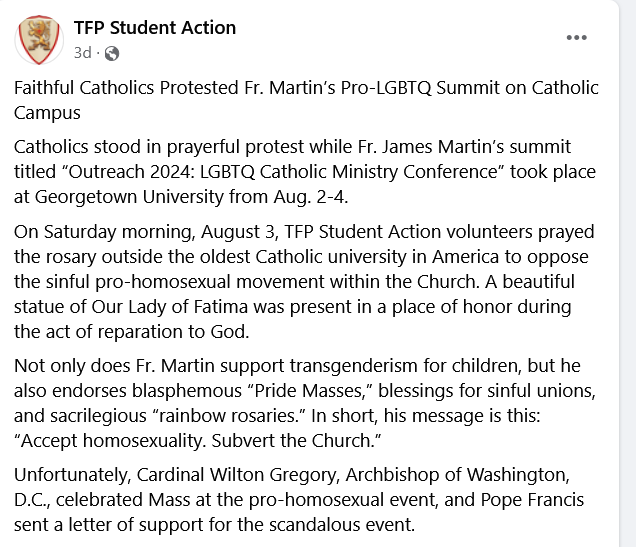 We are pleased that the young men of TFP Student Action were outside the gates of Georgetown this past Saturday to protest this conference and the blaspheming of Holy Mass. Here are some pictures of their prayer effort.