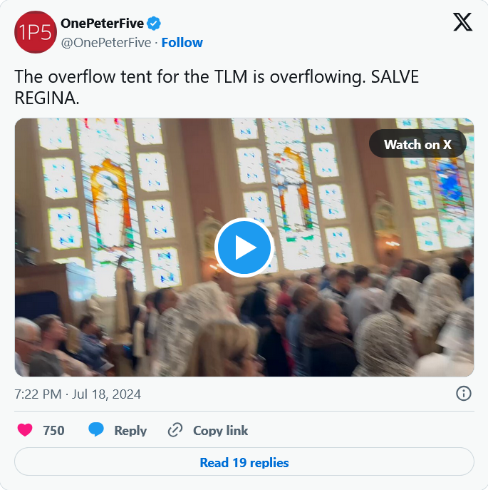 When the feast of Our Lady of Mount Carmel arrived on July 16th, the American Bishops were on their way to the National Eucharistic Congress, where the TLM was an official Mass option twice during the event. Archbishop Cordileone celebrated the ancient Roman Rite while the faithful were overflowing the overflow tent outside: