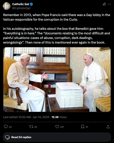 But I must ask regarding that box Benedict gave to Francis. Why did Benedict just pass the problem on to Francis? Popes are absolute monarchs. Benedict had the power to make a clean - yet painful - sweep. But evidently he didn’t.