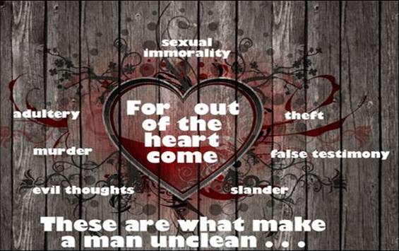 [14] And He (Jesus) called the people to meet Him, and said to them, "Hear Me, all of you, and understand: [15] there is nothing outside a man which by going into him can defile him; but the things that come out of a man are what defile him." [17] And when He had entered the house, and left the people, His disciples asked Him about the parable. [18] And He said to them, "Then are you also without understanding? Do you not see that whatever goes into a man from outside cannot defile him, [19] since it enters, not his heart but his stomach, and so passes on?" (Thus He declared all foods clean.) [20] And He said, "What comes out of a man is what defiles a man. [21] For from within, out of the heart of man, come evil thoughts, fornication, theft, murder, adultery, [22] coveting, wickedness, deceit, licentiousness, envy, slander, pride, foolishness. [23] All these evil things come from within, and they defile a man.