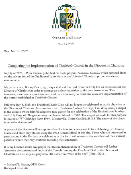 The traditional Catholic social media account Sensus Fidelium posted a copy of the letter to X on Friday morning explaining that the decision shutters two diocesan TLM parishes in Charlotte at St. Ann and St. Thomas Aquinas as well as one in Tyron (St. John the Baptist) and one in Greensboro (Our Lady of Grace).