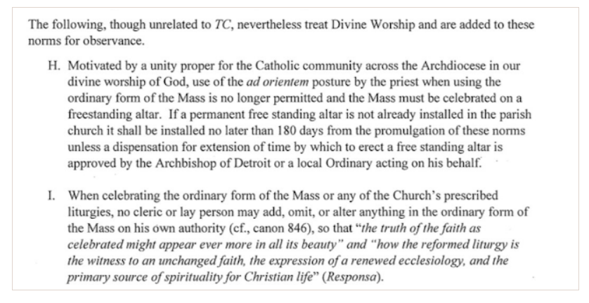 You will recall that in 2021, Pope Francis issued guidelines for the celebration of the Mass in the extraordinary form, commonly called the "Traditional Latin Mass." This is the expression of the Mass which was offered prior to Vatican II. Over the past four years, Archbishop Vigneron issued norms for the Archdiocese of Detroit in this regard. He communicated to the priests that while an extension of permission for parish churches was allowed temporarily, plans should be developed for these communities to come into union with the new liturgical teachings and law of the Church.