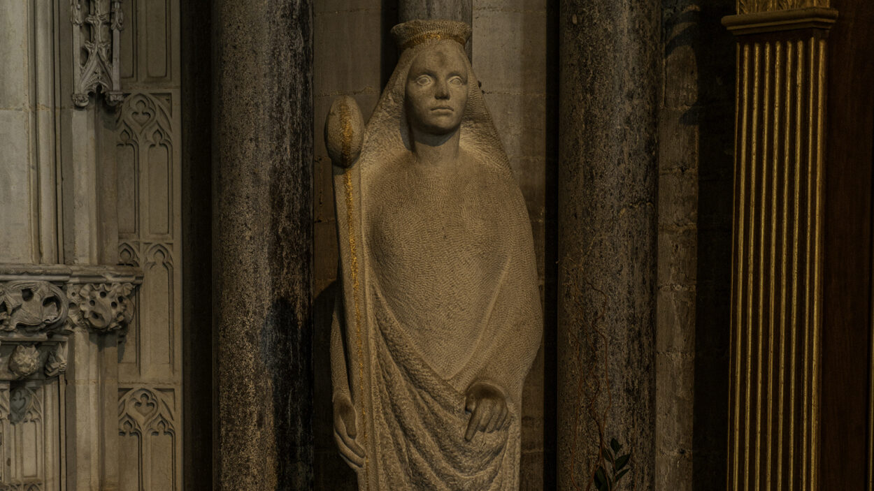 Today, St Etheldreda is still remembered on her feast days of 23rd June (her death) and 17th October (when her body was moved into the Abbey Church). A modern ledger stone marks the site of her shrine in the Presbytery, and some 14th century carvings of her life and miracles can still be found in the Octagon, rare survivals from medieval times. Her image, showing her with royal crown and her Abbess’ staff, features in a number of 19th century stained glass windows.