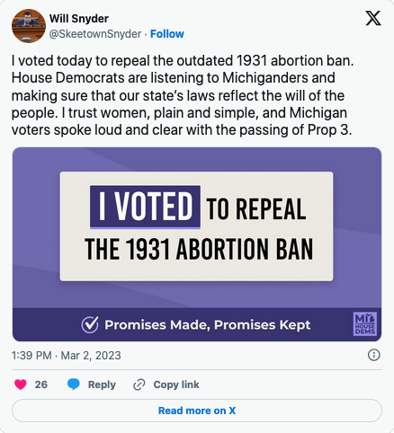 Snyder also bragged in a 2023 X post that he voted to repeal Michigan’s 1931 abortion ban.