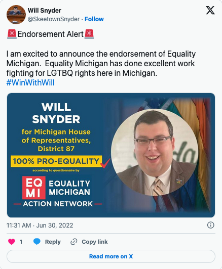 Snyder, meanwhile, was given a “100% Pro-Equality” endorsement from an LGBT group in 2022.