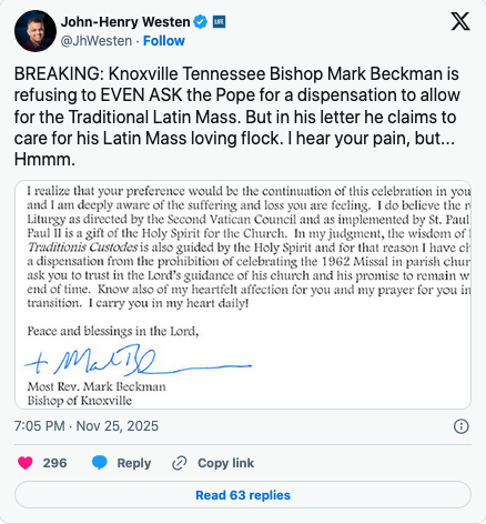 In an X post, LifeSiteNews editor-in-chief John-Henry Westen noted the hypocrisy of Beckman writing that he cares for the faithful devoted to the Latin Mass and yet won’t even ask the Vatican for a dispensation to allow the Latin Mass at parish churches.