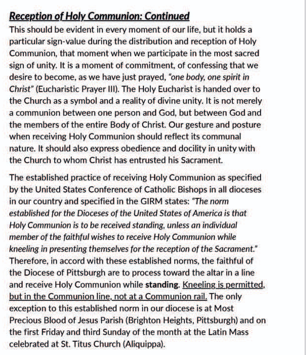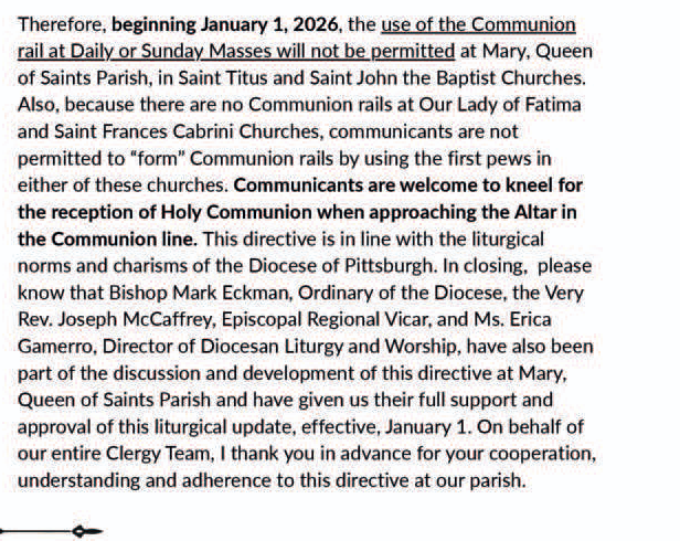The year has not even ended, and the parish (Mary, Queen of Saints, in Aliquippa), under new administration -- now its Novus Ordo will have the use of altar rails banned. You may kneel if you want to (they can't abolish the general law), but without any support.