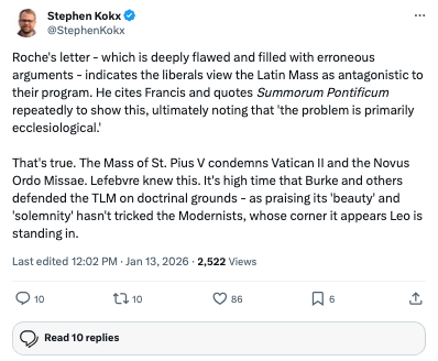 The text states that “the liturgical reform desired by the Second Vatican Council is not only in full harmony with the truest sense of tradition, but constitutes a lofty way of serving tradition so that the latter, like a great river, may lead the Church to the port of eternity.” The British cardinal adds that “without legitimate progress, tradition would be reduced to a collection of dead things, not all of them healthy; without healthy tradition, progress risks becoming a pathological search for novelty, which cannot generate life.” But the ‘broadside’ against lovers of the so-called Tridentine Mass comes at the end. Roche acknowledges that “the application of the reform has suffered and continues to suffer from a lack of formation, and this is the urgent issue to be addressed, starting with the seminaries,” but then goes on to defend the restrictions he has placed on the celebration in the extraordinary form.