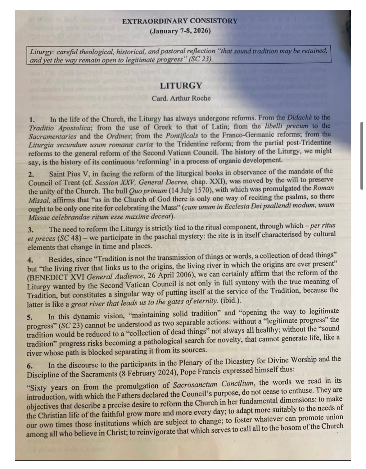 The most revealing line in the broader Roche worldview, echoed in the logic of this report, is the claim that the Church’s theology “has changed,” particularly the relationship between priest and people in the liturgy. The report gestures toward this by presenting the reform as the necessary expression of a new ecclesial self understanding. This is the moment the whole project gives itself away.