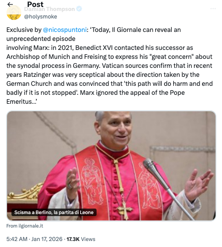 “Vatican sources confirm that in recent years Ratzinger was very skeptical about the direction taken by the German Church and was convinced that ‘this path will do harm and end badly if it is not stopped,’” wrote Spuntoni. “Marx ignored the appeal of the Pope Emeritus.”