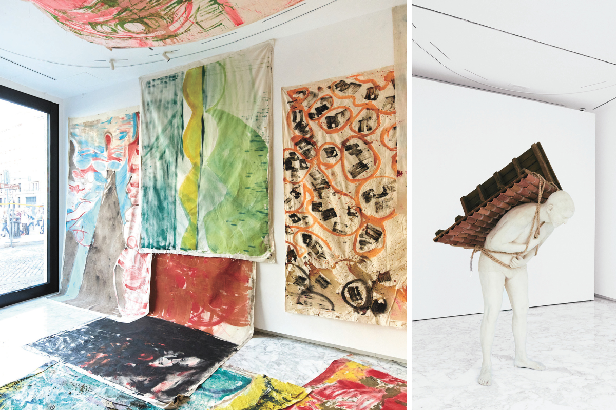 The Conciliazione 5 gallery has showcased, l to r, Brazilian Vivien Suter’s abstract paintings and Adrian Paci’s sculpture of a man carrying a roof on his shoulders.