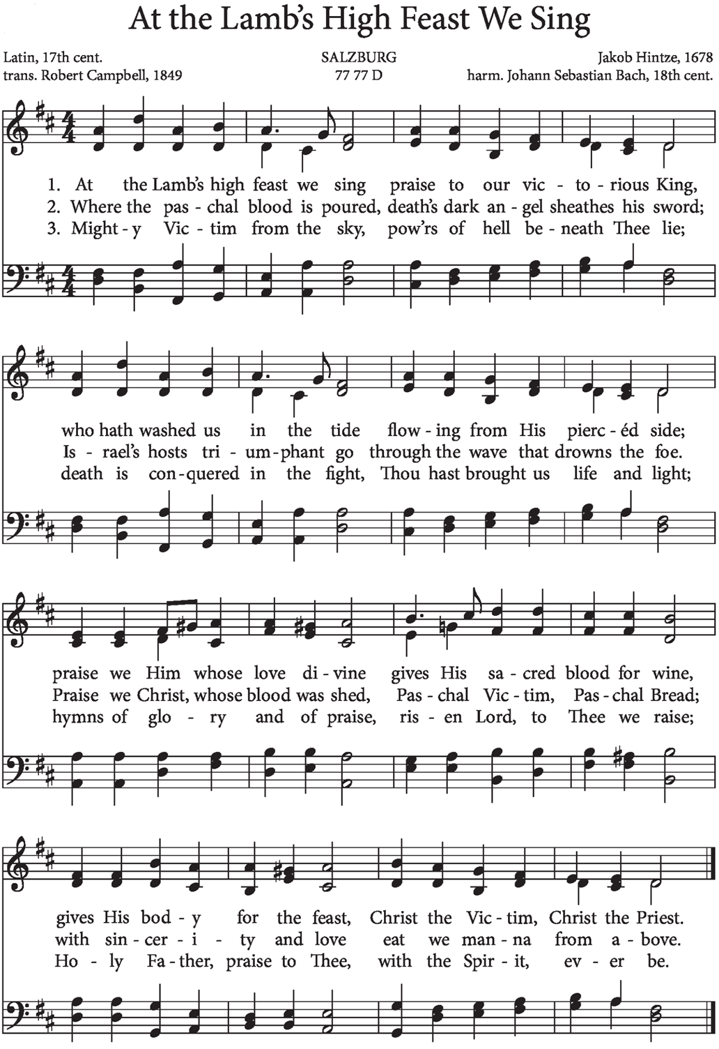 | 1. At the Lamb's high feast we sing praise to our victorious King, who hath washed us in the tide flowing from His piercéd side; praise we Him whose love divine gives His sacred blood for wine, gives His body for the feast, Christ the Victim, Christ the Priest. | 3. Mighty Victim from the sky, pow'rs of hell beneath Thee lie; death is conquered in the fight, Thou hast brought us life and light; hymns of glory and of praise, risen Lord, to Thee we raise; Holy Father, praise to Thee, with the Spirit, ever be. |