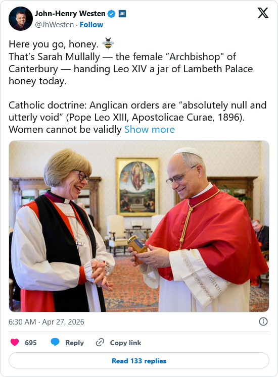 LifeSiteNews CEO and Editor-in-Chief John-Henry Westen noted in a post on X that the Catholic Church does not recognize the ordinations of the Anglican Church as valid and that women cannot be ordained: “Catholic doctrine: Anglican orders are ‘absolutely null and utterly void’ (Pope Leo XIII, Apostolicae Curae, 1896). Women cannot be validly ordained to the priesthood or episcopate.”
