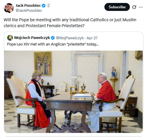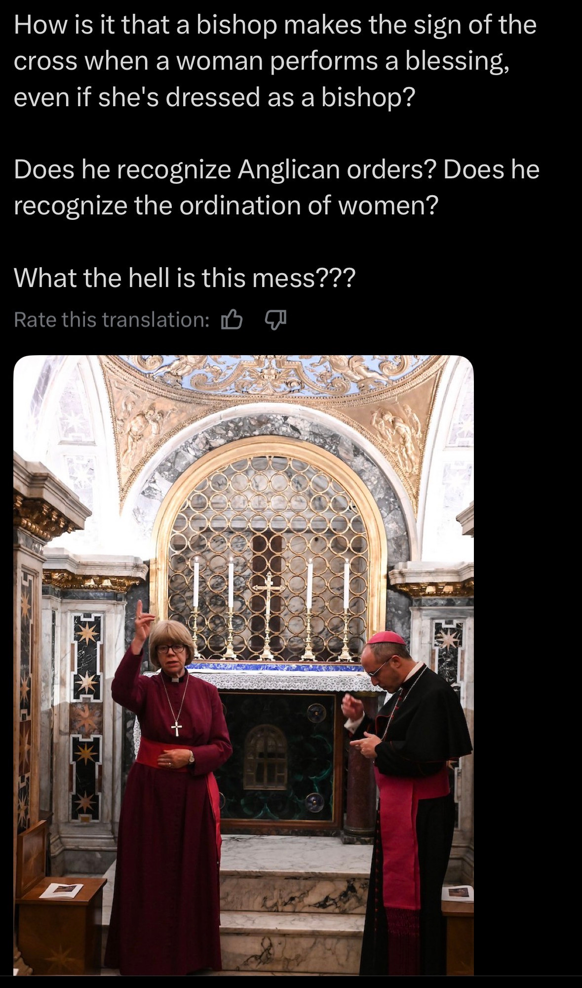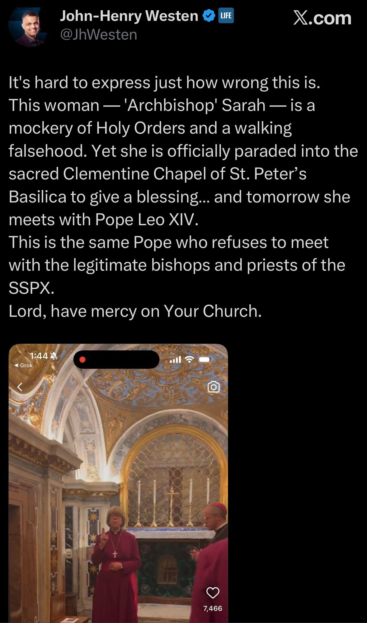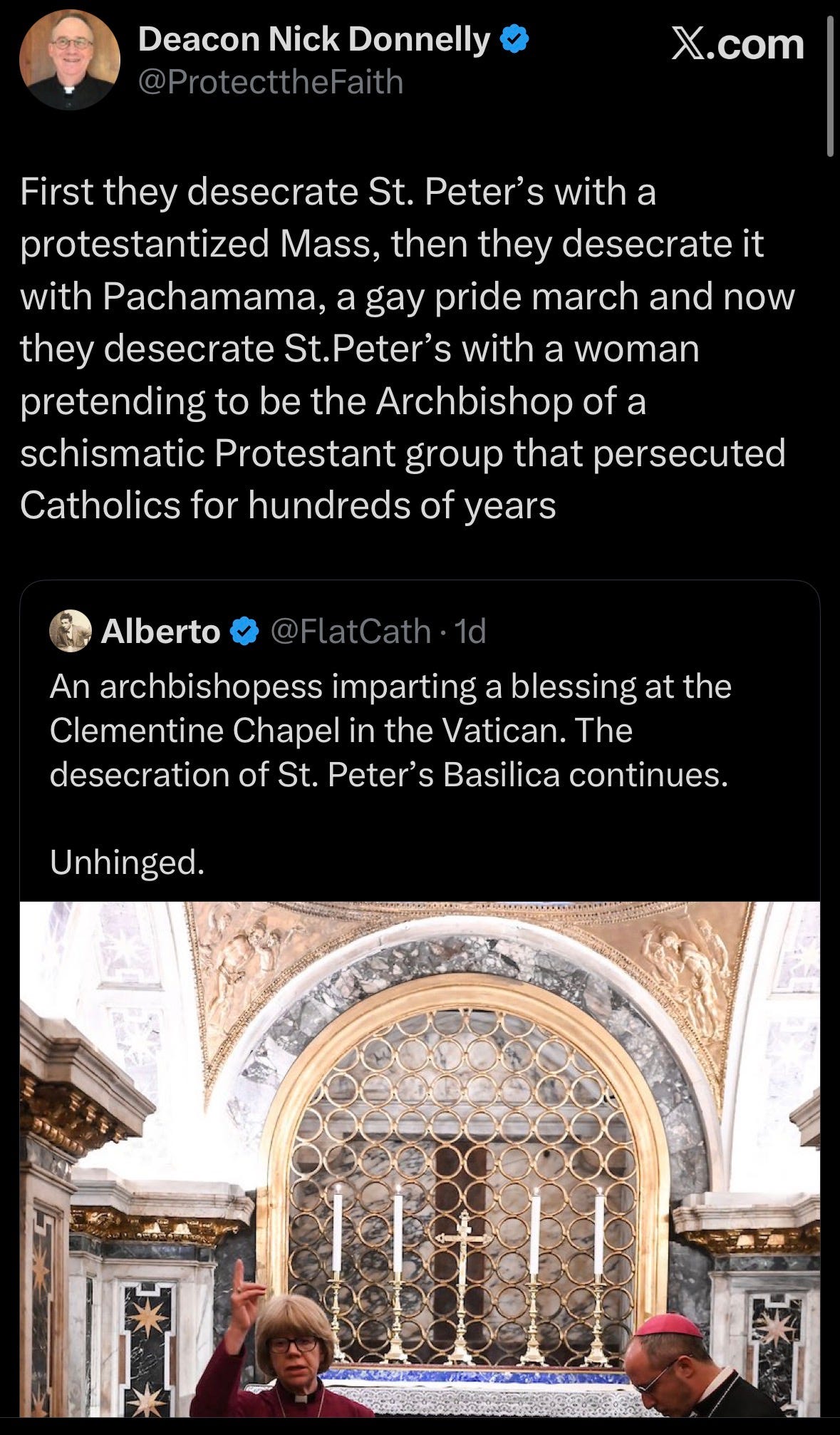 Deacon Nick Donnelly and John-Henry Westen reacted strongly to the Mullally images because the symbolism is too blatant to bury. Even Catholics who usually remain inside the conservative resistance framework can see the contradiction. A woman claiming an episcopal title in a Protestant communion born from anti-Catholic revolt is welcomed into sacred Roman spaces and treated with grave ecumenical seriousness. The SSPX, whatever one thinks of its canonical position, at least preserves valid orders, valid Masses, traditional doctrine, and a priestly life ordered around the old religion.