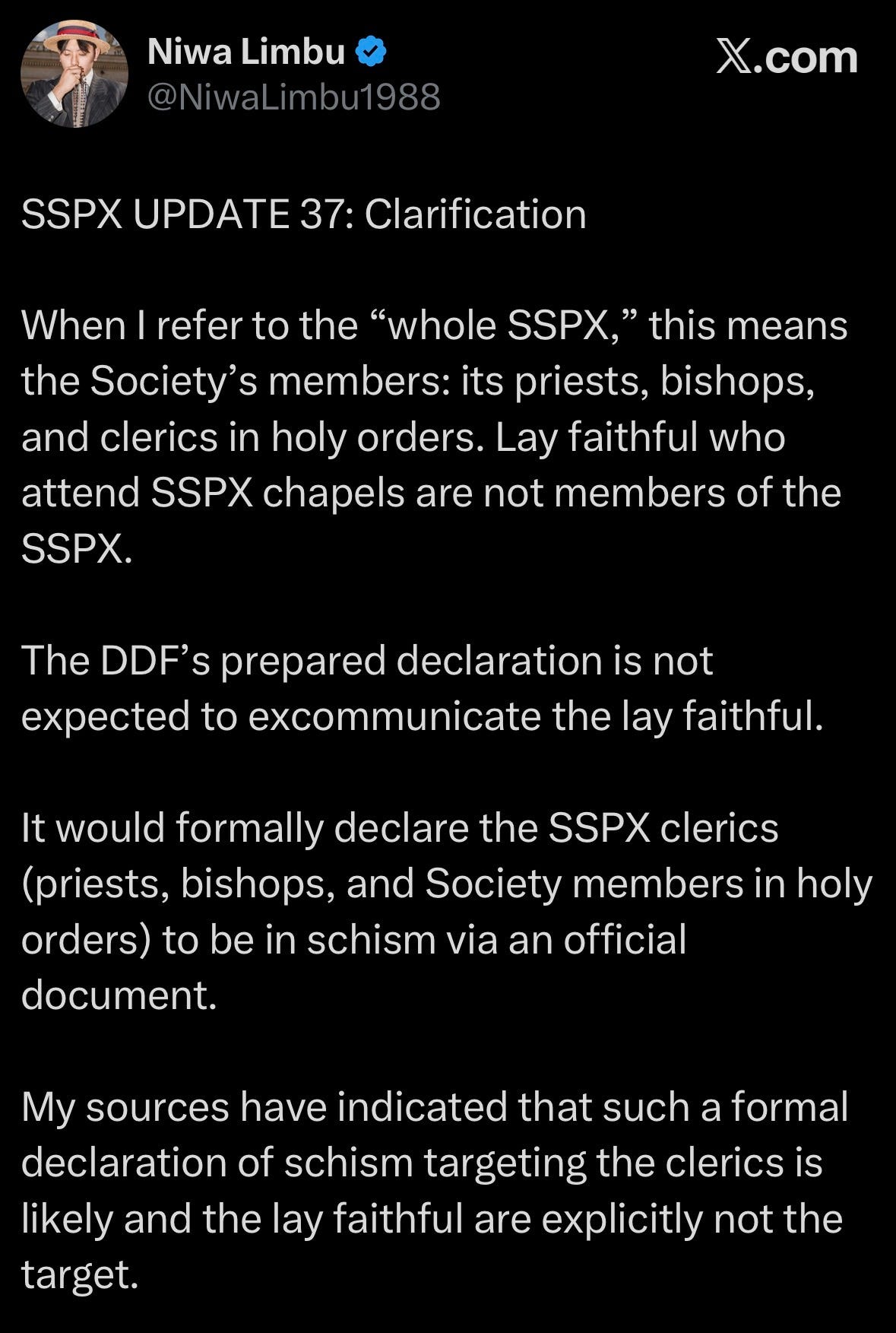 This is why Niwa’s clarification matters. If the DDF is truly considering a declaration aimed at all SSPX clerics, Rome would be taking a very aggressive step. It would effectively say that the Society’s priests and clerics, by belonging to or ministering in the SSPX after these consecrations, are formally adhering to schism or are otherwise subject to a declared penalty.