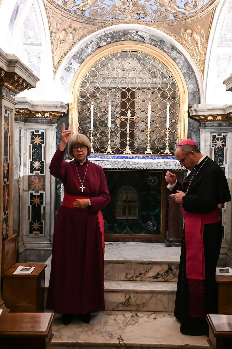 The official Anglican account tells us that Mullally preached at Evensong at St. Paul’s Within the Walls, visited the Lateran and St. Mary Major, prayed at the tomb of Francis, and presided at a Sung Eucharist with baptism at All Saints’ Anglican Church in Rome. The same official page says she would meet and pray with Leo XIV at the Apostolic Palace the following day.