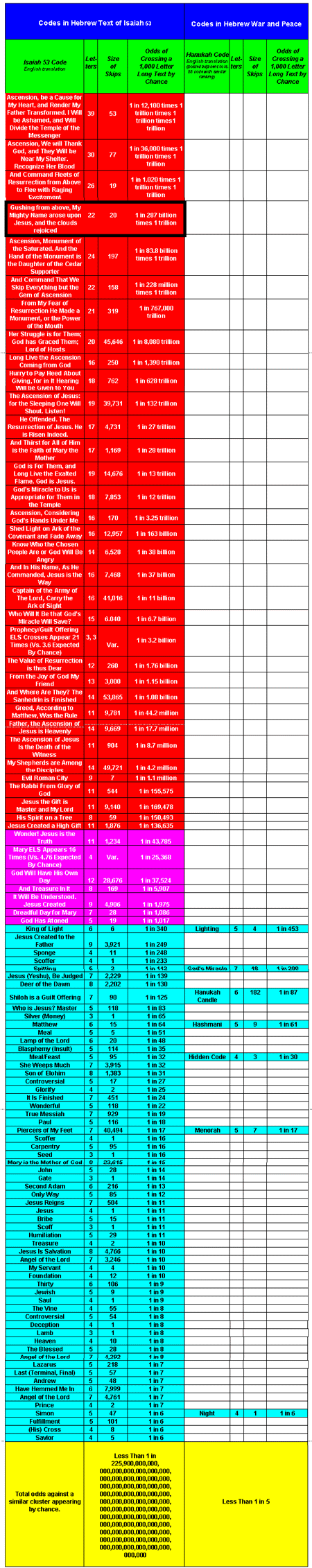 The above odds against a cluster similar to the Isaiah 53 one appearing by chance reflect the possibility that either the above cluster, or any one of 437,200,000,000,000,000,000,000,000,000,000,000,000,000,000,000,000,000,000,000,000,000,000,000,000,000,000,000,000,000,000,000,000,000,000,000,000,000,000,000,000,000,000,000,000,000,000,000,000,000,000,000,000,000,000,000,000,000,000,000,000,000,000,000,000,000,000,000,000,000,000,000,000,000,000,000,000,000,000,000,000,000,000,000,000,000,000,000,000,000,000,000,000,000,000,000,000,000,000,000,000,000,000,000,000,000,000,000,000,000,000,000,000,000, 000,000,000,000,000,000,000,000,000,000,000,000,000,000,000,000,000,000,000,000,000 similar clusters, could appear by chance. Before we reflected this, the unadjusted probability of the exact cluster described above of appearing by chance was so remote that the Excel spreadsheet program could not calculate it. The adjusted probability is 2.3 followed by 212 zeroes.