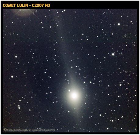 Comet Lulin (C/2007 N3), discovered in 2007 by a Strait-bridging team of astronomers from Taiwan and China, is swinging around the sun and approaching Earth. Astronomer Karzaman Ahmad sends this picture taken Jan. 7th from the Langkawi National Observatory in Malaysia:
