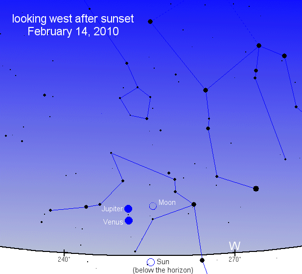SUNSET TRIANGLE: When the sun sets on Valentine's Day, grab your binoculars and dash outside. Jupiter, Venus and an unbelievably slender crescent Moon are converging to form a triangle in the glow of sunset. Scan the western horizon for a beautiful view: