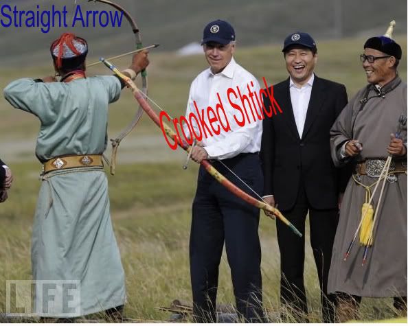 Joe Biden is in Mongolia, where officials took him out for a little archery practice (thats the Prime Minister to his right in the photo). Joe Biden, a bow and an arrow, and that familiar gleam in his eye: what could possibly go wrong?