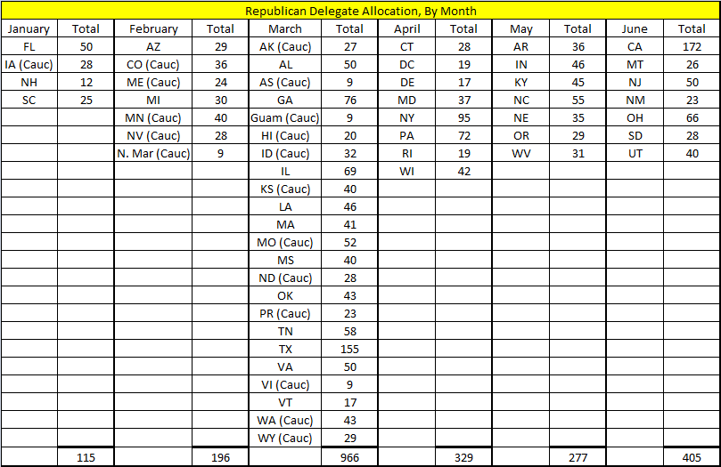 Below is a useful chart of the month that each state holds its primary/caucus, and how many delegates are up for grabs: