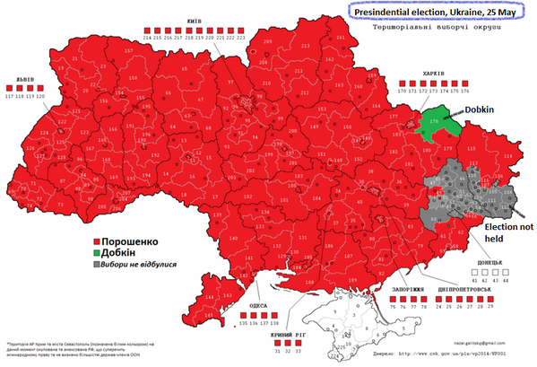 Poroshenko, in the meantime, was elected by a supermajority of the people in a democratic election. His only crime is being known as a moderate and being a Chocolate kingpin. From the election results. The only places that did not vote is the area in Grey, then under Russkie control: