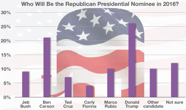 In a survey of Republicans and Republican-leaning independent voters, Trump and Carson both earned 26 percent, while Cruz took 10 percent. Florida Sen. Marco Rubio followed with 9 percent, trailed by former Florida Gov. Jeb Bush (5 percent), Carly Fiorina (4 percent) and New Jersey Gov. Chris Christie, former Arkansas Gov. Mike Huckabee, Ohio Gov. John Kasich and Kentucky Sen. Rand Paul (all at 2 percent).â