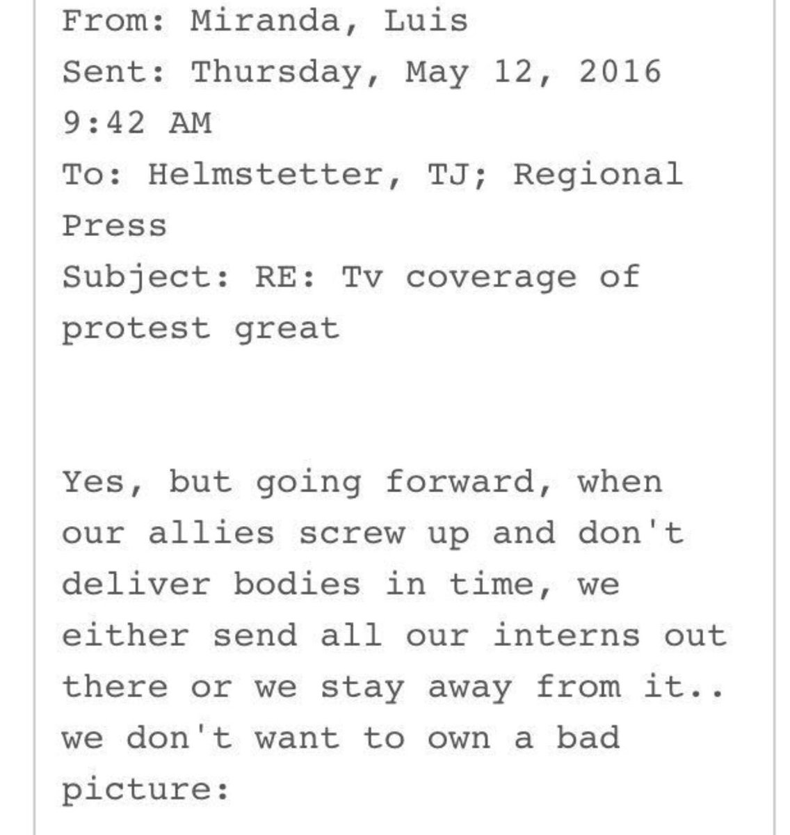 Miranda was notified of the protests in an email by another DNC email chain titled Tv coverage of protest great. The original email notified the DNC communications director of the Indiana protest, and a DNC staffer wrote, thanks to our interns for finding this out.
