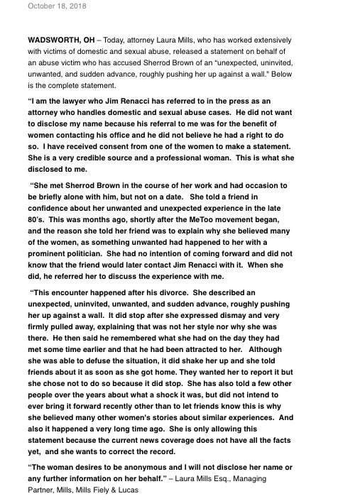 The release includes a lengthy statement from Laura Mills, a Canton attorney and former Renacci business partner and political donor. In the statement, Mills says the woman told her friend about the encounter as the MeToo movement unfolded. It occurred while the woman was alone with Brown, who was divorced at the time, through her work, Mills said. The friend then contacted the Renacci campaign, which referred the woman to Mills, the statement says.