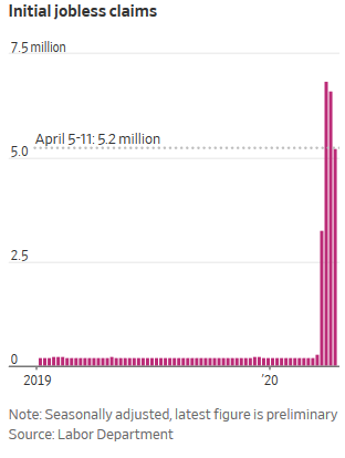 That brings total claims over the four weeks ended April 11 to nearly 22 million workers, erasing the entirety of labor market gains since the 2008 financial crisis, a stunning sign of the colossal economic damage inflicted by the virus outbreak. Before the pandemic, the largest number of Americans to seek jobless aid in a four-week stretch was 2.7 million in the fall of 1982.