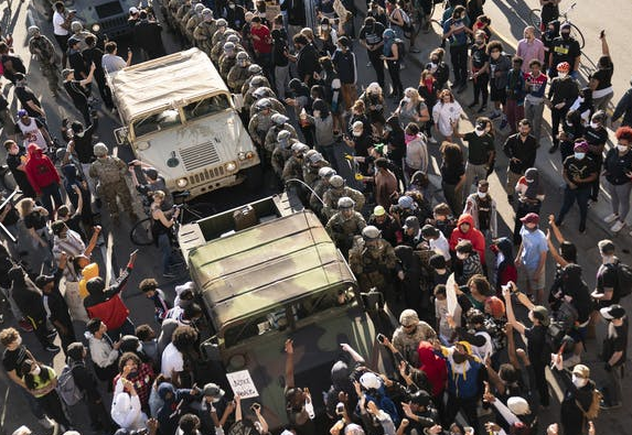 A group of protesters surrounded several National Guard vehicles that were driving on Lake Street towards the blockade under the Hiawatha Light Rail station in Minneapolis.