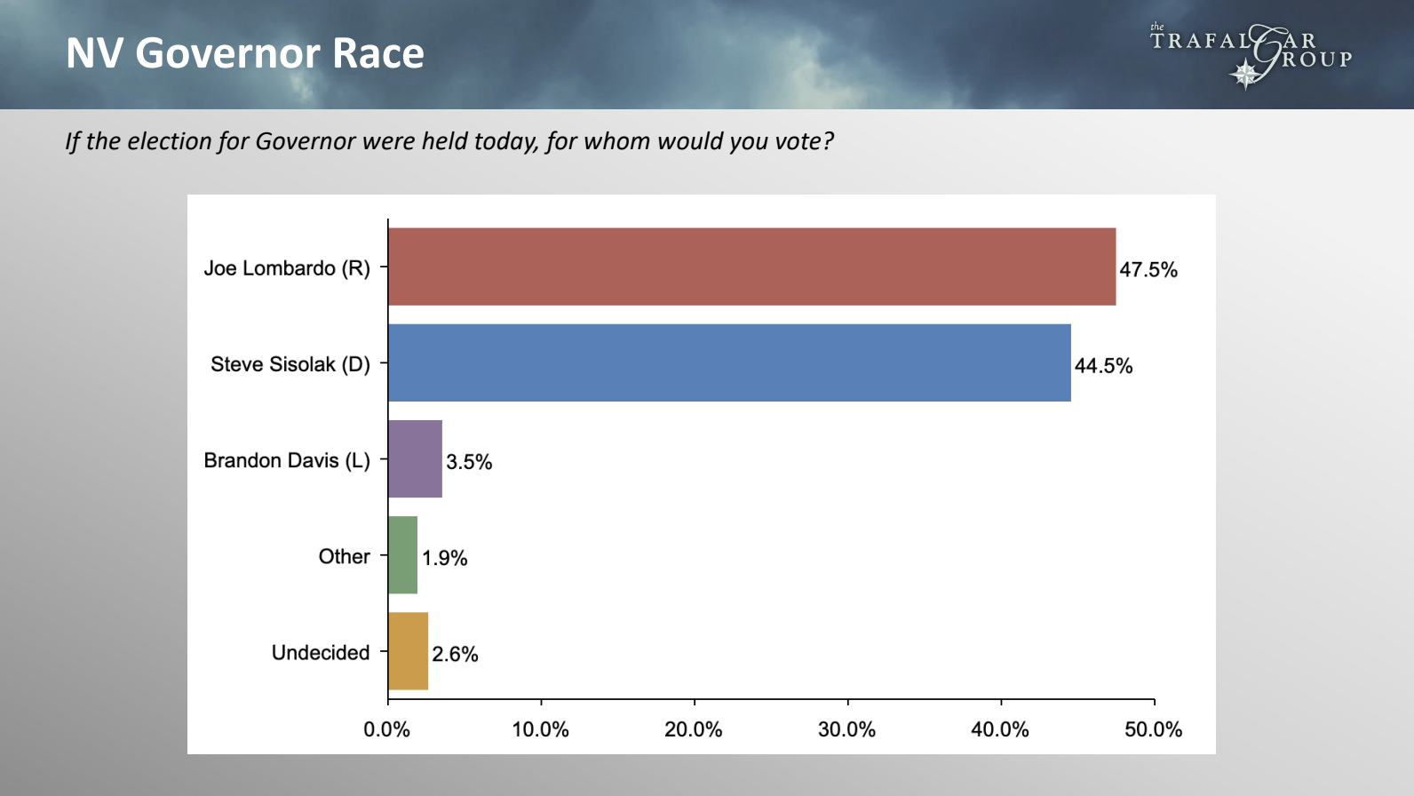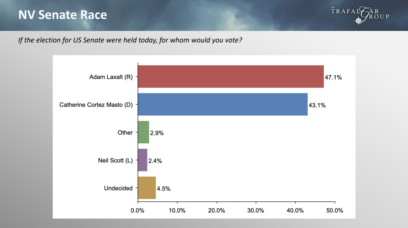 The poll, conducted by independent pollster Rich Baris, found when asked if the election for U.S. Senate was held today, 49% of Nevada Hispanics would vote for Laxalt and 41% for Cortez Masto. The remaining were undecided or would choose a third-party candidate.