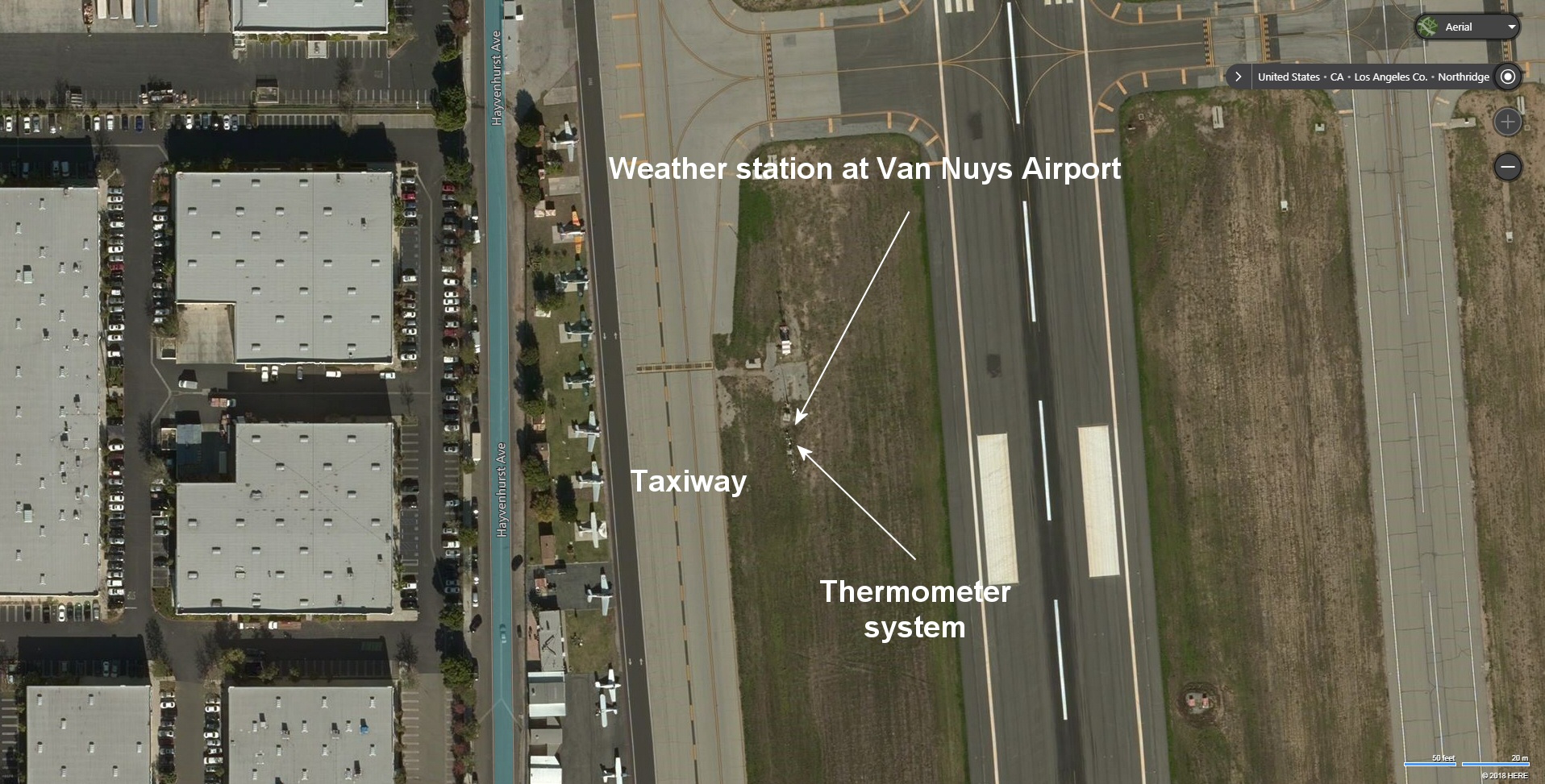 • A sensor in Marysville, Calif., sits in a parking lot at a fire station right next to an air conditioner exhaust, a cell phone tower and a barbecue grill.