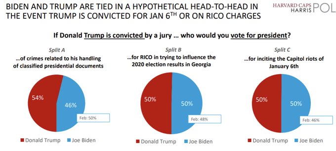 Most interesting of all is the fact that voters are largely discounting Donald Trump's legal troubles, with his poll numbers not budging much even were he to get convicted. Whether that is because people think the legal attacks are illegitimate or because they have been around so long that they have been factored in, voters don't seem inclined to change their opinion about who they will vote for.